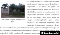 "Un día de octubre 2015 está trabajando en su garaje cuando llega una docena de policías e inspectores a su puerta. Le piden los documentos legales de la casa, los recibos de electricidad, licencia de cuentapropista y le inspeccionan totalmente el taller. Irónico que en un país donde cuesta tanto armar un equipo multidisciplinario para temas necesarios, se conformen fácilmente para tareas así. Desde entonces comienzan a llegar las visitas con frecuencia, a menudo dos en un día, en busca de irregularidades que les permita multar. El expediente en su contra va tomando forma sin que el hombre sepa responderle al niño cuando este le pregunta si les van a quitar la casa".